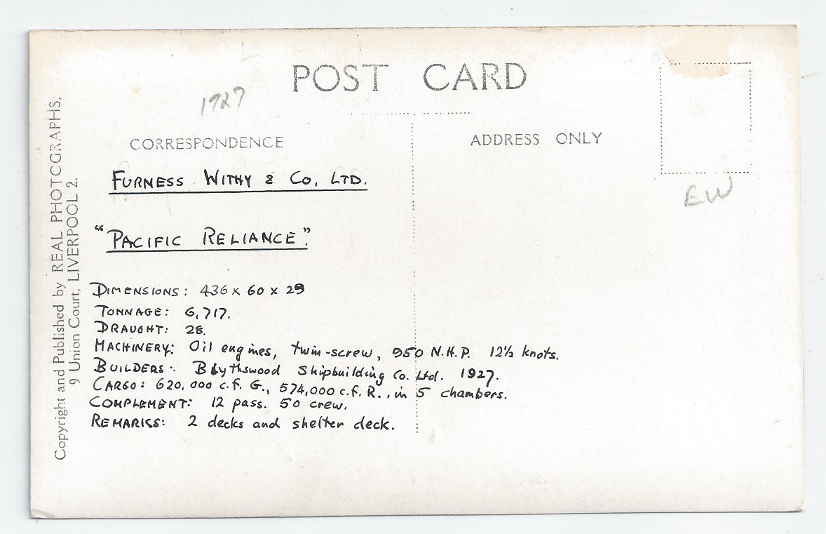 Pacific Reliance Postally unused RP PC (Real Photographs)