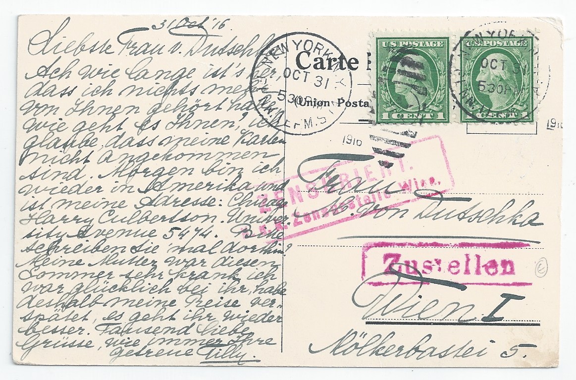 Noordam Used PC (Van Leer) - New York 1916 postmarks + KuK censor ink stamps