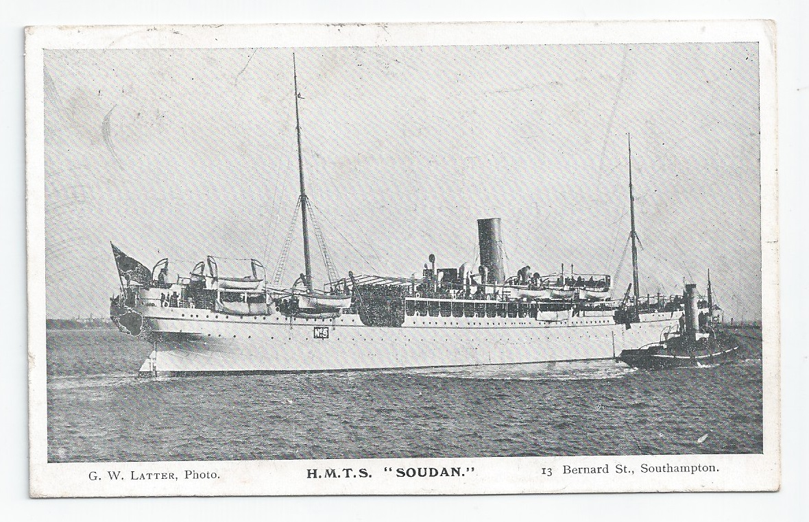 HMT Soudan, troopship Used PC (G W Latter) - Gibraltar 1908 + Paquebot postmarks