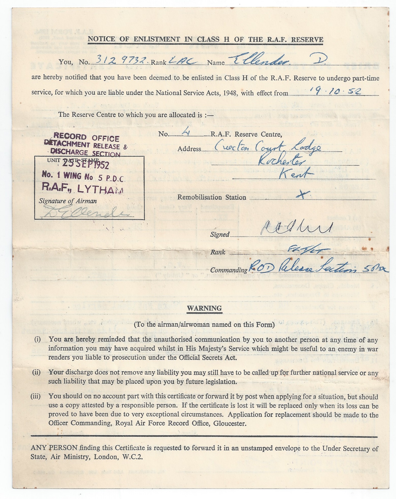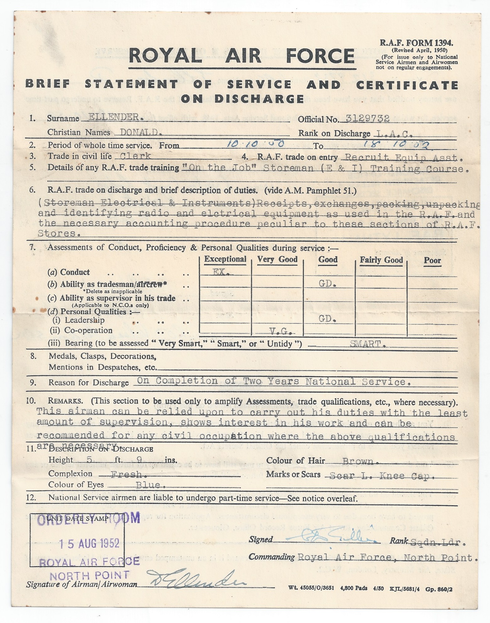54 RAF Discharge Certificate