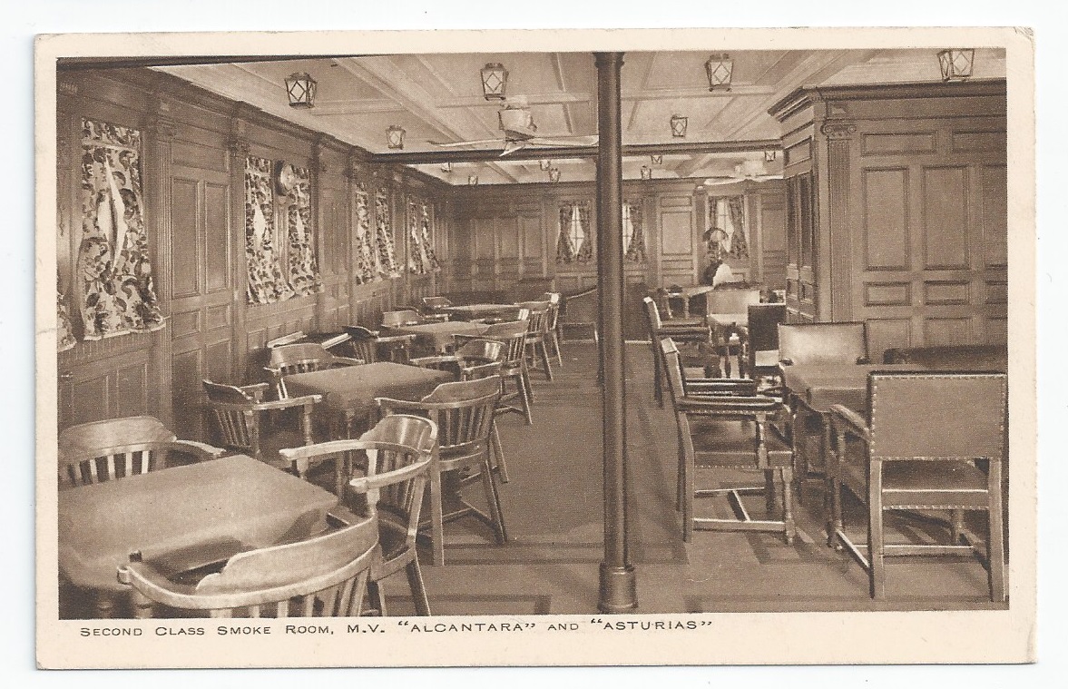 Alcantara / Asturias 2nd Class Smoke Room + Halkett Hotel (Jersey) advert Postcard